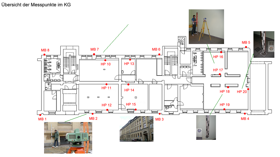 Der zweite Teil der Überwachung beinhaltete die Setzungsmessung von elf Punktpärchen (bestehend aus zusammengehörigen Wand- und Bodenpunkten), welche im Kellergeschoss angebracht wurden. Dabei wurden die Höhenunterschiede zwischen den Punktpärchen beobachtet, um einen möglichen Grundbruch frühzeitig zu erkennen.